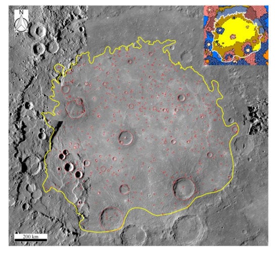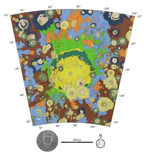The exterior smooth plains were initially distinguished by [26] into two different units. Following only a morphological classification we were also able to distinguish two smooth plains outside the basin, quite similar to those identified by [26], but with slightly different boundaries (see the detail in Figure 3).