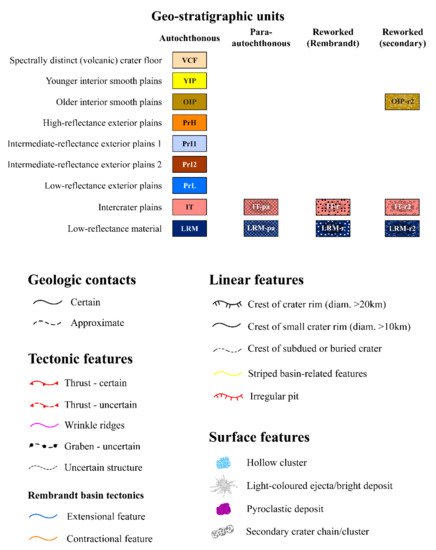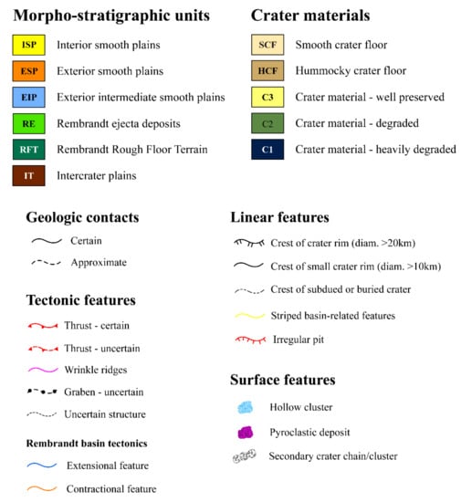 Within our maps we identified all tectonic structures. In particular, we mapped as “thrust” both lobate scarps and high-relief ridges, which are respectively asymmetrical landforms associated with thrust faults [48,55,56,57,58] and symmetrical narrow ridges associated with buried high-angle reverse faults [56,57,58,59,60]. More limited in length and with lower amount of displacement are wrinkle ridges [61,62,63], i.e., other landforms associated with thrust faults but commonly observed within volcanic plains [57,58,64]. Furthermore, in the W-NW portion the Rembrandt basin is crosscut by an extensive lobate scarp, i.e., the Enterprise Rupes, which we identified within both maps with the label “ER”. All these tectonic structures are interpreted as evidence of planetary cooling and contraction [27,48,56,64,65,66].