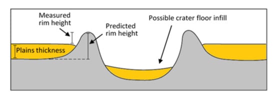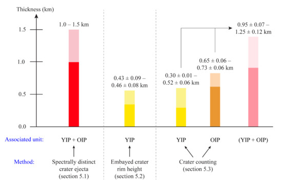 The geo-stratigraphic map reports two different infillings (YIP and OIP) and two base layers (LRM and IT) within the Rembrandt basin. This allowed us to proceed with thickness estimates of the two plain units, by applying several methods previously adopted by different authors [12,25,26] and merging them in a unified framework. In the following sections we present each method along with results and discussions. Subsequently, a final interpretation is given, together with our estimate of the total volume of lava infilling.