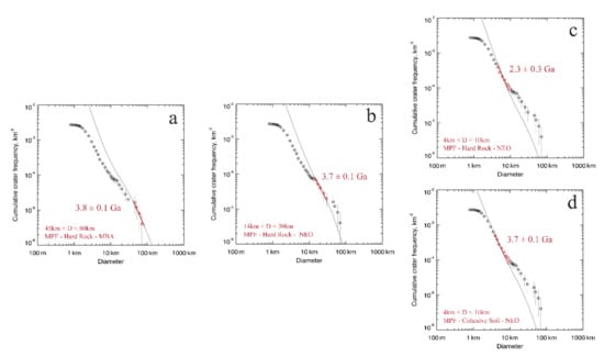 - Michael, G.G.; Neukum, G. Planetary surface dating from crater size-frequency distribution measurements: Partial resurfacing events and statistical age uncertainty. Earth Planet. Sci. Lett. 2010, 294, 223–229. [Google Scholar] [CrossRef]