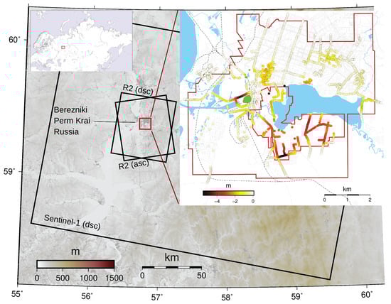 Area of interest (AOI, brown rectangle) is city of Berezniki in Perm Krai, Russia. Outlines of RADARSAT-2 and Sentinel-1 swaths are shown in black. Background is 30 m Shuttle Radar Topography Mission (SRTM) digital elevation model. OpenStreetMap data (downloaded from http://download.geofabrik.de.) is shown as grey lines. Left insert shows location of AOI in Eurasia. Right insert shows cumulative ground subsidence since at least 2012 measured by precise leveling. Rail roads are shown as dashed lines. Three sinkholes are shown as green polygons. The outlines of mining operations of carnallite (seam B) and sylvinite (seam Kr II) are shown as red and brown polygons, respectfully.