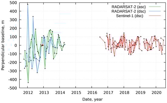 In this study we used the following satellite SAR data (Table 1): 37 ascending and 34 descending Ultra Fine Wide RADARSAT-2 images acquired during the period October 2011–April 2014 with 24 days revisit cycle and 96 descending Interferometric Wide Swath Sentinel-1 images acquired during the period July 2016–June 2020 with 12 days revisit cycle. No ascending Sentinel-1 data was available for this region and no data at all was available between April 2014 and July 2016 (Figure 2). Each SAR data set was processed independently with GAMMA software [] as follows. A single master image for each set was selected and the remaining images were re-sampled into the master geometry. We used 4 in range and 4 in azimuth multi-looking (i.e., spatial averaging) for RADARSAT-2 interferograms and 4 in range and 1 in azimuth for Sentinel-1 interferograms. The topographic phase was removed using the 30 m resolution Shuttle Radar Topography Mission [] Digital Elevation Model. Differential interferograms were filtered using adaptive filtering with a filtering function based on local fringe spectrum [], and unwrapped using the minimum cost flow algorithm []. The residual orbital ramp was corrected by applying a baseline refinement algorithm implemented in GAMMA software. The atmospheric errors were not corrected since there is no reliable technique that can be used for such purpose over this small area. The spatial resolution of current atmospheric models is tens of kilometres. Instead, we relied on the least-square solution built into our processing software that naturally minimizes temporally uncorrelated atmospheric errors. Minor interpolation of each interferogram was performed in order to improve spatial coverage reduced by decorrelation and a mean coherence mask (0.4 for RADARSAT-2 and 0.57 for Sentinel-1, coherence values are after filtering) was applied to remove incoherent pixels.