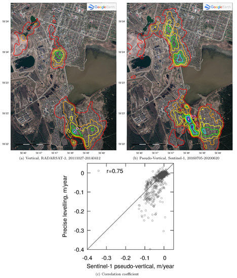 RADARSAT-2 vertical (a) and Sentinel-1 pseudo-vertical (b) deformation rate during 27 October 2011–12 April 2014 and 5 July 2016–20 June 2020, respectively, shown as colour-coded contours: red (−0.02 m/year), orange (−0.04 m/year), yellow (−0.06 m/year), green (−0.08 m/year), cyan (−0.10 m/year), blue (−0.12 m/year). Background imagery is from Google Earth Pro V 7.3.3.7786 (https://www.google.com/earth [22 September 2020], Copyright Maxar Technologies). Water bodies in the top-left quadrant are flooded sinkholes. Correlation coefficient (c) between 5 July 2016–20 June 2020 Sentinel-1 pseudo-vertical deformation rate and 2018–2019 geodetic precise leveling vertical deformation rate.