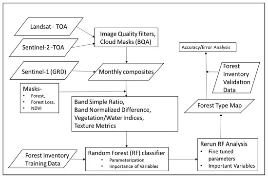 - Test the accuracy of mapping the revised forest classes using recent active and passive sensors—Sentinel-1, Sentinel-2 and Landsat-8.