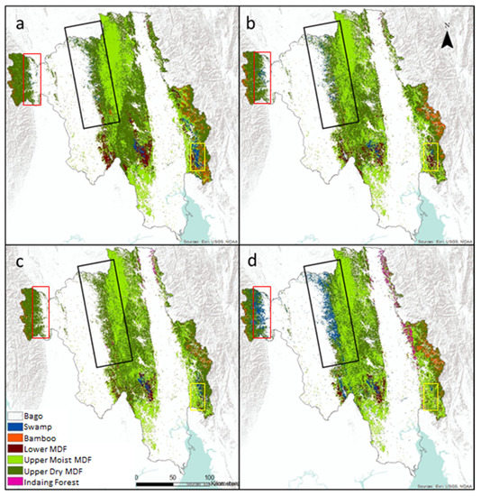 - Connette, G.; Oswald, P.; Songer, M.; Leimgruber, P. Mapping distinct forest types improves overall forest identification based on multi-spectral Landsat imagery for Myanmar’s Tanintharyi Region. Remote Sens. 2016, 8, 882. [Google Scholar] [CrossRef]