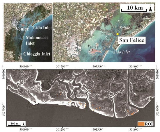 The Venice lagoon (top panels in Figure 1) is located in northeastern Italy and is connected to the Adriatic Sea by three inlets: Lido, Malamocco, and Chioggia. The main rivers that used to debouch into the lagoon were diverted directly to the sea in the XVI–XIX centuries [], and only a few small rivers now remain, carrying modest amounts of freshwater and sediments into the lagoon. The Venice lagoon has an area of about 550 km2 and is characterized by a semidiurnal tide with an average tidal range of about 1.0 m and a maximum spring tidal range of approximately 1.5 m [,].