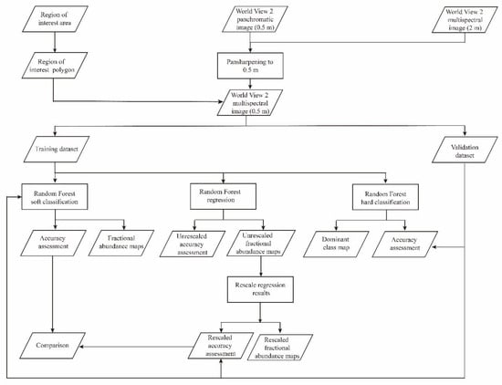 We developed and tested RF unmixing methods with application to WorldView-2 (WV-2) data. The workflow of this study is shown in Figure 2.