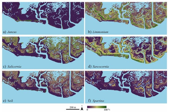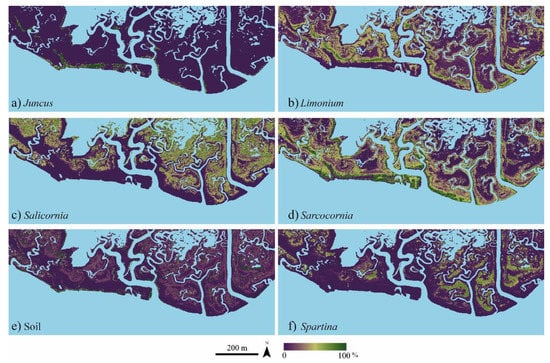 Maps of the individually predicted abundance of vegetation species obtained based on the RF regression. Specifically, (a–f) are maps of abundance of Juncus, Limonium, Salicornia, Sarcocornia, Soil and Spartina, respectively. Light blue areas represent water.