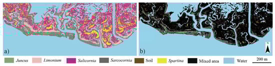 Due to the high biodiversity of halophytic vegetation species on marshes, we argue that traditional hard classification methods (i.e., where classifiers tend to associate each pixel to an individual species or to bare soil) [,] cannot provide accurate information on vegetation distribution. Indeed, pixels (whose sizes are in the order of 0.5–1 m) in remote sensing images are often composed of highly mixed vegetation associations [,], particularly over salt marshes. The results obtained with the hard classification (Figure 6a) allow us to perform a further analysis of the results obtained with the RF soft classification (Figure 6b). Specifically, we notice that the position of patches occupied by dominant classes agrees quite well with those obtained with a RF hard classification, thus suggesting the robustness of the RF soft method. Furthermore, we notice that some large mixed areas, composed by more than one species (or bare soil), cannot be detected by the hard classification method. These areas are mostly located in the inner portions of the marsh, where topographic elevations are relatively low [,] and inner species (Salicornia and Spartina) are always mixed with bare soil. Finally, we also notice that mixed areas are observed in Limonium-dominated areas in the hard classification results. This can be attributed to the fact that Limonium and Sarcocornia tend to colonize the same areas.