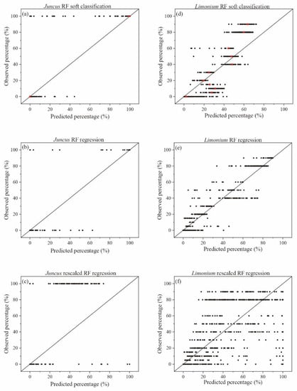 Validation results for Juncus and Limonium: (a,d) are predicted probabilities (x-axis) plotted against the validation data; (b,e) are regression results (x-axis) plotted against the validation data; (c,f) are rescaled regression results (x-axis) plotted against the validation data. Red dots represent the mean of the predicted percentage using the RF soft classification.