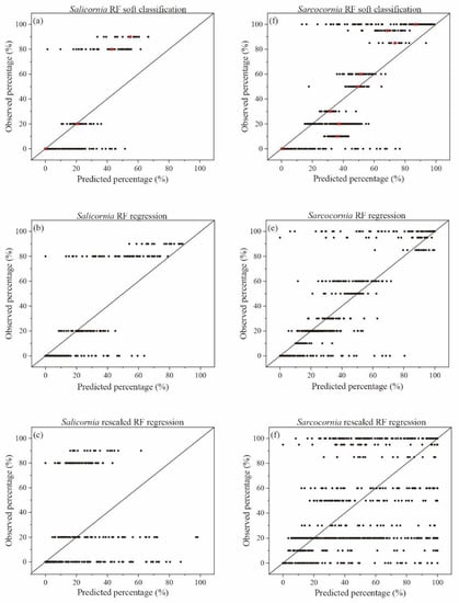 Validation results for Salicornia and Sarcocornia: (a,d) are predicted probabilities (x-axis) plotted against the validation data; (b,e) are regression results (x-axis) plotted against the validation data; (c,f) are rescaled regression results (x-axis) plotted against the validation data. Red dots represent the mean of the predicted percentage using the RF soft classification.