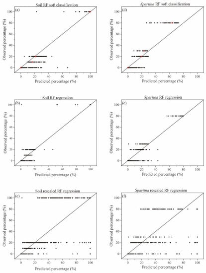 Validation results for Soil and Spartina: (a,d) are predicted probabilities (x-axis) plotted against the validation data; (b,e) are regression results (x-axis) plotted against the validation data; (c,f) are rescaled regression results (x-axis) plotted against the validation data. Red dots represent the mean of the predicted percentage using the RF soft classification.