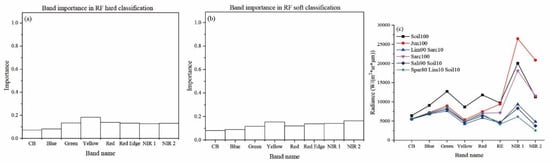 Band importance for different methods and reflectance characteristics of each class: (a,b) are the relative importance of each band for RF hard classification and RF soft classification, respectively; (c) is calculated by average radiance value of corresponding ROI (CB is Coastal Blue, RE is Red Edge).