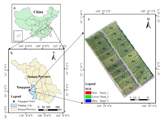 Geographic location of the research area and a UAV image of the experimental plots with 5 fertilization treatments ((a), the location of Jiangsu Province in China; (b), the location of Nanjing City in Jiangsu Province and the location of Tangquan Town in Nanjing City; (c), a UAV image of the experimental plots).
