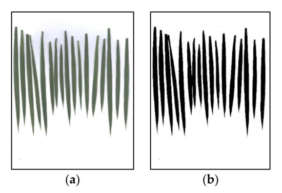 (a) Scanned image of the leaves; and (b) the binarized image results of the scanned image.