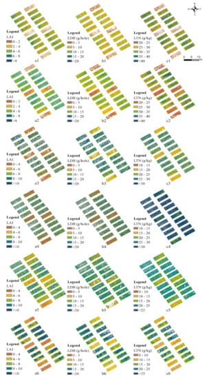 Estimated maps of the key monitoring indicators at different growth stage. LAI, LDB, and LTN at the tillering stage (a1,b1,c1), early jointing stage (a2,b2,c2), late jointing stage (a3,b3,c3), heading stage (a4,b4,c4), flowering stage (a5,b5,c5), and filling stage (a6,b6,c6).