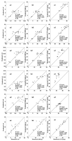 Verification of the estimation results of the key growth indicators at different growth stages. LAI, LDB, and LTN at the tillering stage (a1,b1,c1), early jointing stage (a2,b2,c2), late jointing stage (a3,b3,c3), heading stage (a4,b4,c4), flowering stage (a5,b5,c5), and filling stage (a6,b6,c6).