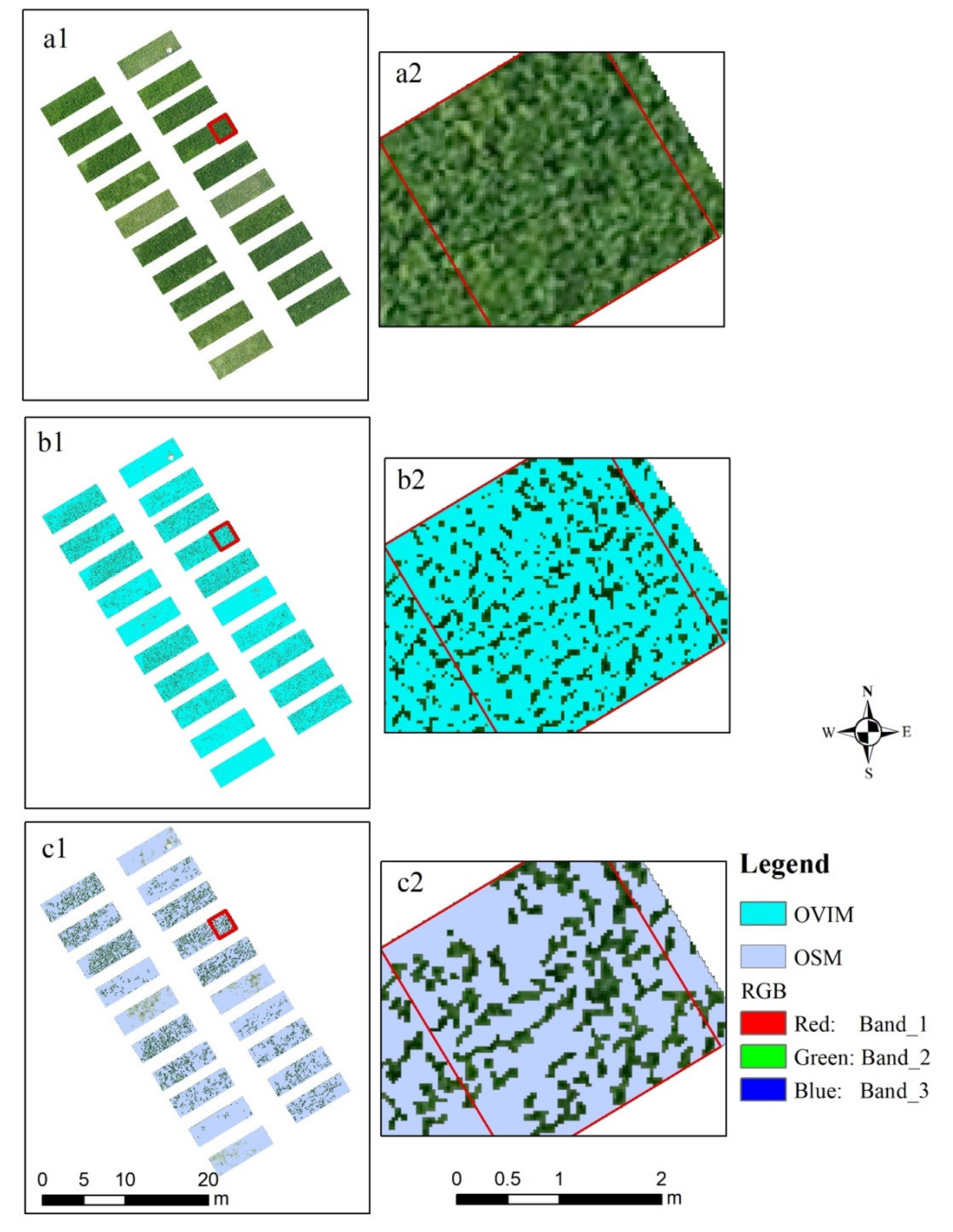 The results of noncanopy pixel removal of UAV images. (a1,a2: original UAV images; b1,b2: the process of OVI method; and c1,c2: the process of OS method; a2,b2,c2 are the magnified results of a certain area in a1,b1,c1, respectively).