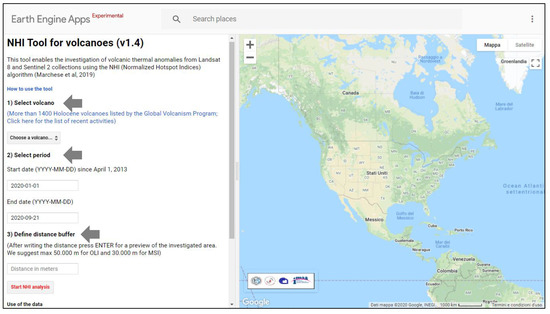 In a previous paper [35], we tested the NHI algorithm over a number of active volcanoes located in different geographic areas, retrieving information about thermal anomalies in good agreement with independent field and satellite-based observations. These results encouraged us to implement the algorithm within the GEE environment, as discussed in detail in Section 2.3.