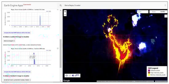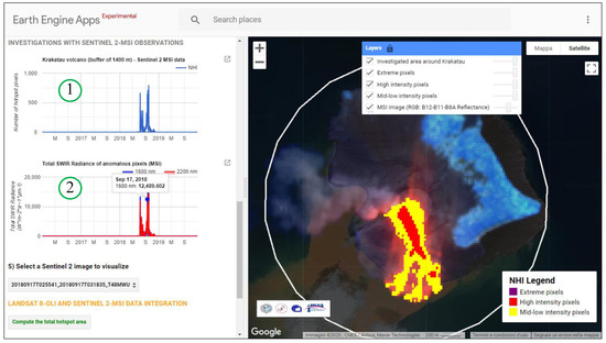 As for previous tool versions, users may access the client-side of the GEE App through the graphical user interface (GUI). In detail, users may run the process through the “Start NHI Analysis” button after selecting the volcano of interest, from a drop-down menu, and setting the temporal range and the distance buffer (DB). The system generates two charts of hot spot pixel number, one for each data collection (see plot 1 in Figure 2), except when, due to the imposed computation limits of the GEE platform, a high distance buffer (i.e., >50 km for Landsat-8; >30 km for Sentinel-2 data) is used [41]. Users may then visualize the additional plots of total SWIR radiance, which is calculated by summing radiances of detected hot spot pixels at the relative SWIR wavelength (plot 2 in Figure 2), and of total hot spot area (see Section 3.2). These products may be download in three different formats, i.e., comma-separated values (CSV), Scalable Vector Graphics (SVG) and Portable Network Graphic (PNG), for the offline analysis of results. Once the system generates these charts, users may overlap thermal anomalies to a static very-high resolution image or a topographic map of the volcano. Finally, the “Layers menu” area allows users to visualize five different layers including: (i) the investigated area (white circle); (ii) three groups of hot spot pixels, classified as mid-low intensity pixels (in yellow), high-intensity pixels (in red) and extreme pixels (in violet) (see Table 1); (iii) the RGB product of the selected satellite scene (see Figure 2).