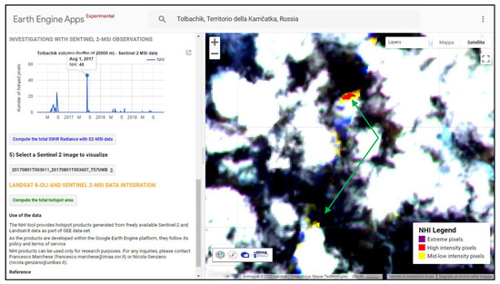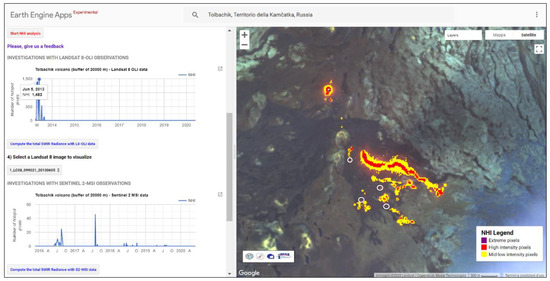 To assess the capacity of the NHI tool in providing information about unrest and quiescence periods of active volcanoes, we show in Figure 3 the results of the Tolbachik (Kamchatka, Russia) volcano investigation, performed by analyzing L8-OLI and S2-MSI data of April 2013–May 2020.