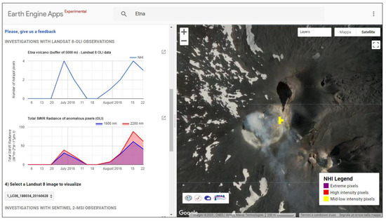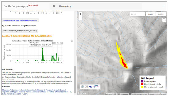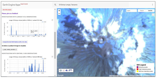 By coupling an efficient single image algorithm to the high computational resources of the GEE platform, the NHI tool is capable of providing accurate information about volcanic thermal anomalies, with low processing times. Only a few seconds are, in fact, required to generate the tool outputs; the computational time may increase up to a few minutes when long-time series of satellite observations, at a high distance buffer, are analyzed (e.g., charts of Figure 3 were generated in less than one minute).