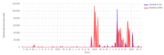 Plot of total hot spot area retrieved at Karangetang (Indonesia), referring to the same time-period of Figure 5. The plot was generated offline integrating Sentinel-2 MSI (red curve) and Landsat-8 OLI (blue curve) observations.