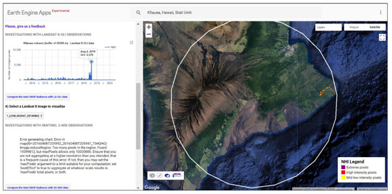In this work, we investigated a number of active volcanoes characterized by a different thermal activity using a different DB as input, based on their relative size. At Campi Flegrei, which is a caldera of about 12 km in diameter [63], we used for instance a DB value of 6 km (see Table 2). The NHI tool helps users in setting the DB through a preview of the selected volcanic area. Nevertheless, in some volcanic regions this parameter may be more difficult to be set properly. As an example, by setting a DB ≥ 3.0 km at Acatenango (Guatemala), whose last eruption occurred in 1972 [64], we retrieved the same results for Fuego volcano, showing frequent eruptions and belonging to the same volcanic complex (Acatenango-Vulcán de Fuego massif). On the other hand, at Kilauea (Hawaii) a high DB value (50 km) was required to investigate the Lower East Rift Zone (LERZ) [65] (see Figure 9). In this case, the developed platform generated only outputs from L8-OLI data because of GEE restrictions (see Section 2).