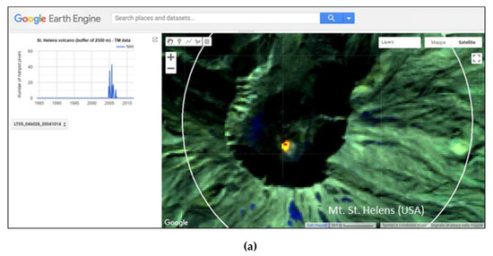 Among the next tool upgrades, the use of Thematic Mapper (TM)/ Enhanced Thematic Mapper plus (ETM+) and ASTER data, could make more than 30 years of satellite observations available to users, enabling the analysis of worldwide volcanoes before the first availability of L8-OLI data. Figure 13 emphasizes this potential, showing the preliminary results of the Mount St. Helens (USA) and Eyjafjallajökull (Iceland) investigations, achieved using Landsat-5 TM and Landsat-7 ETM+ data, respectively. In detail, Figure 13a shows that an intra-crater thermal anomaly affected the Mount St. Helens on 14 October 2014. This feature was generated by a documented lava dome growth inside the crater [73,74], affecting other satellite scenes of 2004–2006 (see chart of hot spot pixel number referring to period 1985–2010). Figure 13b displays the lava flow emitted by the Eyjafjallajökull volcano on 3 April 2010 and generated by an intense effusive eruption which started the previous month after about two centuries of quiescence, previously investigated from space by means of infrared MODIS data [75]. It should be noted that, despite the striping in Landsat-7 ETM+ imagery (e.g., [76]), the analyzed time series (from 1999 to 2011) did not reveal any false detection (see quiescence periods correctly marked by the tool before and after the end of eruption). Thus, the NHI tool seems to perform well in using also TM/ETM+ data, although the impact of other issues (e.g., oversaturation effects [77]) needs to be better assessed. Additionally, even though the malfunctioning of ASTER SWIR detectors does not enable the analysis of satellite imagery acquired after 2008 (see Section 1), the ingestion of ASTER data within the tool could contribute to better analyzing past eruptions, thanks to the better dynamic range in the SWIR region (e.g., [78]).