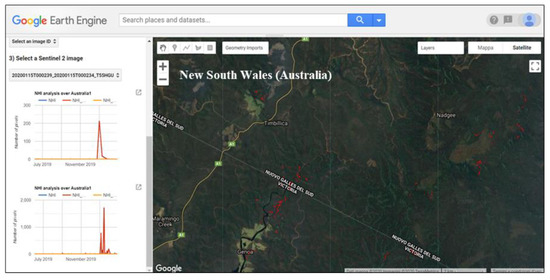 Since the NHI algorithm is sensitive to wildfires (e.g., [35]), we could develop a similar GEE App also to map forest fires at local/regional scale. Figure 15 shows forest fires (in red) identified on S2-MSI scene of 15 January 2020, affecting the New South Wales region (Australia). These features were among the numerous, large and devastating fire events occurring during the 2019–2020 Australian bushfire season (e.g., [84,85]). Although these features were slightly underestimated, as indicated by the manual inspection of satellite imagery, and even if other investigations are required to assess NHI performance under different fire regimes, the GEE App of Figure 15 could contribute in assessing risk of wildland–urban interface fires, complementing information from operational fire monitoring systems (e.g., [86]).
