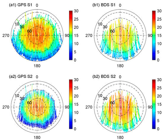 Sky-plots of Signal to Noise Ratio (SNR) (unit: dB-Hz) of GPS and BDS observations on date of year (DOY) 202, 2018. The (a1) and (a2) panels show the SNR of GPS L1 (S1) and L2 (S2); the (b1) and (b2) panels show the SNR of BDS B1 (S1) and B2 (S2).