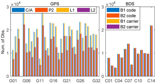 Figure 2 displays sky-plots of Signal to Noise Ratio (SNR) variation with elevation and azimuth in the antenna reference frame (ARF). It is evident that in all cases, the SNR becomes weaker at lower elevations. For GPS, the SNR is higher for L1 than for L2 frequencies. Further tracking losses in L2 data can be observed when the elevation drops below 20°. Unlike the GPS case, the SNR of BDS B1 is lower than that of B2, which may be due to the different signal modulation method and transmission power of B1 and B2. The horizontal distribution of BDS B1 and B2 is similar. Figure 3 shows the number of GPS and BDS observations on DOY 202, 2018. Note that there are no observations for G04 during the study period. It can be seen that there are approximately 30% fewer GPS P2/L2 observations than GPS CA/L1 observations. This is mainly due to the lower transmitting power of L2, which leads to a weaker signal more prone to losses, especially at low elevations (Figure 2). For BDS, the number of B1 and B2 observations is comparable. In general, the conclusions drawn from Figure 3 are consistent with those in Figure 2.