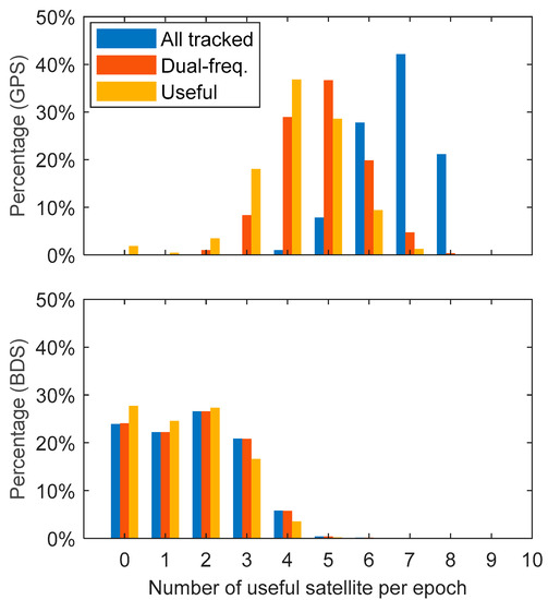 Dual-frequency ionosphere-free linear combinations of GPS and BDS data are used for POD of the CSES. Due to tracking losses at one frequency, there are more tracked observations than dual-frequency observations. Furthermore, short arcs and epochs with large residuals will be excluded from the orbit solution. Therefore, there are less useful observations than dual-frequency observations. Figure 4 shows the average percentage of all tracked (blue), dual-frequency (red) and useful (yellow) GPS and BDS satellites per epoch during the experiment. The largest number of tracked GPS satellites is seven, however, it is reduced to five for dual-frequency satellites and four for useful satellites. Only 11% of epochs possess from six to eight useful satellites. The statistics of BDS are quite different from that of GPS; the composition of dual-frequency data is similar to that of tracking data, which is consistent with Figure 2. As for the useful satellites, about 27% of epochs have zero satellites and less than 5% of epochs have more than three satellites. Compared to the Fengyun-3C satellite, the average number of useful GPS and BDS satellites tracked by the CSES is approximately two fewer per epoch [14,18].
