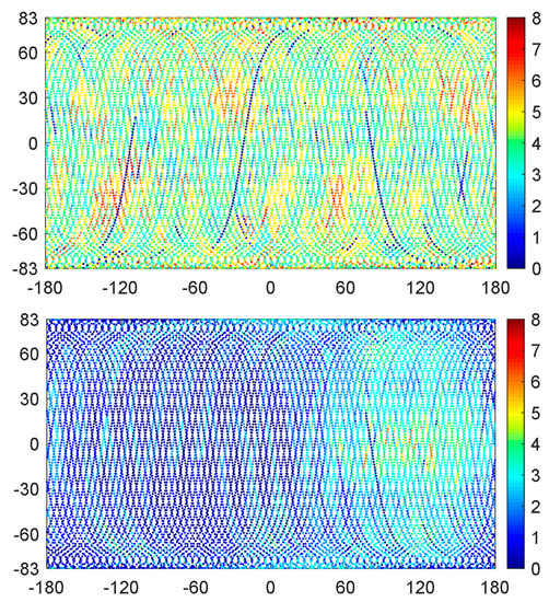 The revisit period for the CSES is five days [17]. The useful number of GPS and BDS satellites along the CSES ground tracks of the five-day arc from DOY 202 to DOY 206, 2018 are shown in Figure 5. It is obvious that the number of useful GPS satellites is evenly distributed across the globe. However, the observed useful BDS satellites are mainly distributed in the Eastern Hemisphere, while most of the Western Hemisphere has only zero to two satellites available. This is because the BDS-2 constellation is mainly distributed in the Asia–Pacific Ocean region. Only few epochs have six usable satellites, reaching the maximum number of BDS channels allocated for positioning antenna, because in most cases, at least two of the channels receiving BDS signals are allocated for occultation antennas.