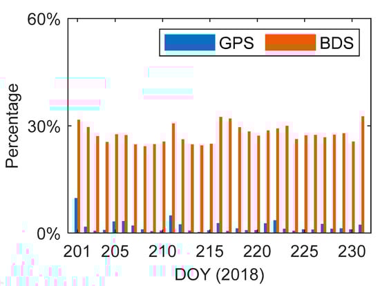 CSES’ onboard GPS (blue) and BDS (red) data loss percentage for each POD arc from DOY 201 to DOY 231, 2018. The X-axis represents the first day of one POD arc.