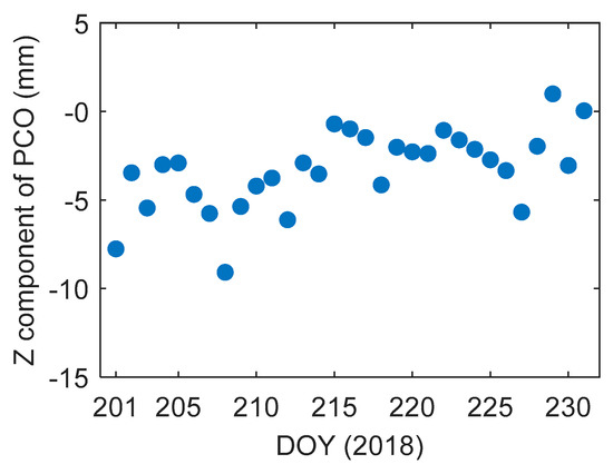 Choi [29] demonstrated on the Jason-1 satellite that the X and Y components of PCO cannot be separated from the along-track and cross-track empirical parameters. The Z component of PCO, however, can be determined when there is no empirical constant radial acceleration. Thus, only the Z component of PCO was estimated in the current study. Figure 7 shows the estimated values of each orbit arc during the one-month study period. It can be seen that the estimated Z component value fluctuates from −10 mm to 0 mm with a linear slope. The average value of Z component estimation is −3.4 mm and the standard deviation is 2.2 mm. The trend of the results will be more reliable and accurate if the data series covers one year.