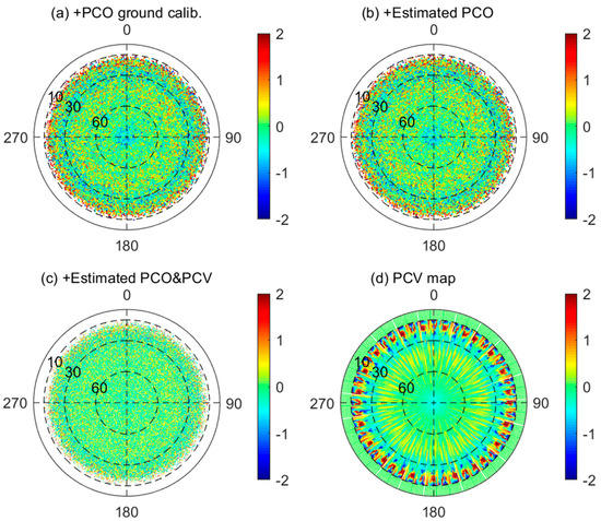 Figure 8 displays the phase residuals of CSES POD solutions obtained using PCO ground calibration-only (Figure 8a), estimated PCO (Figure 8b) and the estimated PCO and PCV map (Figure 8c). The azimuth-elevation diagram of the PCV map is also plotted (Figure 8d). Due to the small estimated value of the Z PCO component, the residual distribution of solutions with (Figure 8b) and without (Figure 8a) estimated PCO is almost the same, and the residual varies significantly with elevation. With PCV corrections, the residuals are nearly uniformly distributed. Table 3 gives the residual RMS of the above solutions. For the PCO ground calibration case, the residual RMS is 5.63 mm. After PCO and PCV correction, the residuals improved significantly to 4.11 mm.