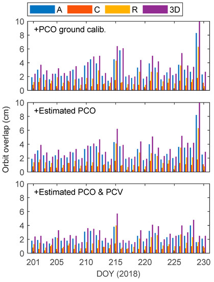 Table 3 summarizes the RMS of the orbit overlap differences. When only PCO ground calibration was used, the 3D RMS is 3.65 cm. The solution improved slightly where the PCO was estimated. Adding PCV correction led to a significant improvement, with 3D RMS values of 2.80 cm. The statistics of the central 5-h orbit overlap differences are also summarized in Table 3. Due to the reduction in edge effect, the 3D RMS value of 1.86 cm was obtained for the solution with both PCO and PCV corrections. Figure 10 shows the daily RMS of the full 6-h orbit overlap differences. After PCV correction, the orbit overlap differences of each arc were improved. In the following section, the PCO and PCV corrections estimated in this section will be applied.