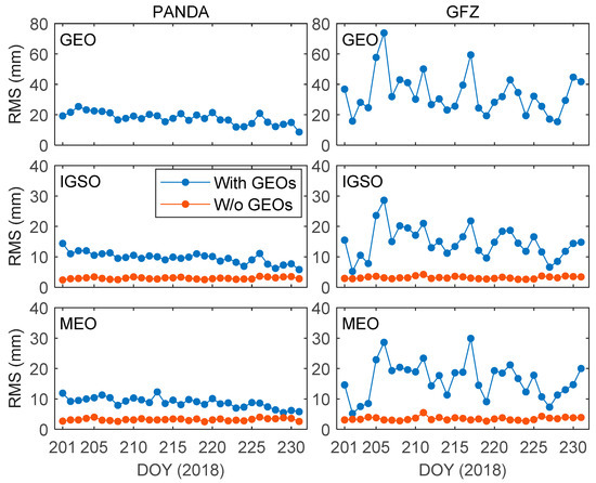 Post-fit residual RMS of BDS carrier phase of each POD arc. The left panels show the residuals based on PANDA BDS products; the right panels show the residuals based on GFZ BDS products. In both plots, the blue dots represent the approach with GEO satellites and the red line is the approach without GEO satellites.