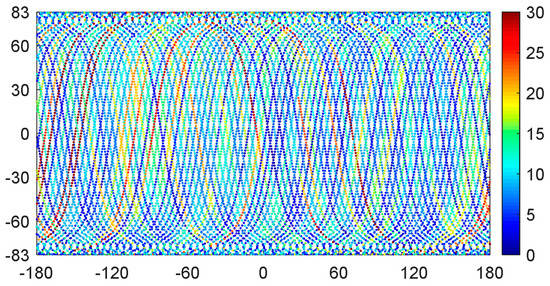 In the POD data processing, some issues on the dynamic model and the observation model need to be considered. The Earth gravity model of Earth EIGEN-6C [21] was used. The EIGEN-6C model includes a static part and a temporal part. The box-wing model [22] is used to calculate the solar radiation pressure (SRP) on the satellite. The SRP of the satellite’s solar panels are not considered yet as a detailed rotation model of these is not available. Another important issue is the type and estimation interval of piecewise dynamics parameters (atmospheric drag coefficients and empirical accelerations) used to compensate for dynamic errors. These parameters are often estimated empirically for each orbit revolution, as the mismodelled or un-modelled forces acting on satellites usually vary according to the orbital period. In this study, the drag coefficients were estimated every four cycles, i.e., every 360 min. The piecewise periodic empirical accelerations in the along-track, cross-track and radial direction were estimated every 90 min for both GPS-based POD and combined GPS and BDS POD. For the BDS-only solution, because of the small number and uneven distribution (Figure 5) of observations, the 1CPR empirical accelerations were estimated every 360 min to ensure sufficient observations for each set of parameters.