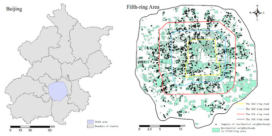 where is the estimated population, is the actual population, and n is numbers of samples. At the subdistrict level, only the subdistricts completely located in the fifth-ring area were included because of the limited census by administration units. In addition, the estimated population from dasymetric mapping approach was only used to compare with that from the statistical modeling approach at the residential neighborhood level.