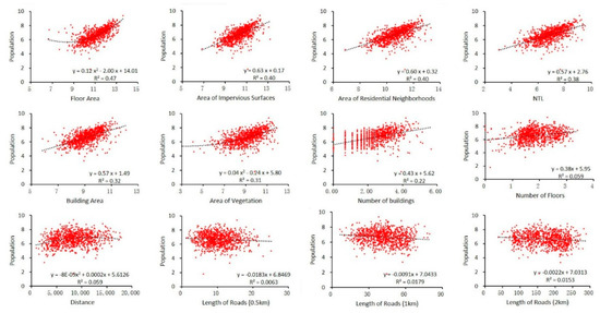 There are various and complex relationships between population and its related factors, including linear relationships, U-shaped relationships, and inverse U-shaped relationships (Figure 3). The area of impervious surfaces, the area of residential neighborhoods, the NTL data, the building area, and the number of buildings exhibited significant positive linear relationships with population. The number of floors exhibited weak positive linear relationships with population. The length of roads exhibited weak negative linear relationships with population. Among three buffers around residential neighborhoods, the length of roads in 1 km buffer exhibited the strongest correlation with population. Therefore, only the length of roads in 1 km buffer was used to represent the traffic factor to estimate population. The floor area and the area of vegetation exhibited significant U-shaped relationships with population. The distance exhibited weak inverse U-shaped relationships with population.