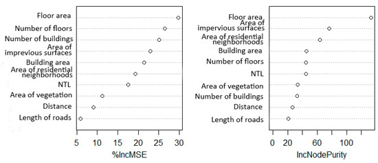 The relative importance values of the population-related factors in the RF regression are shown in Figure 4. The relative importance values of %IncMSE and IncNodePurity were some different. For example, floor area ranked second for %IncMSE but fifth for IncNodePurity, and area of impervious surfaces ranked fourth for %IncMSE but increased to second for IncNodePurity. However, some similarities could also be found. The indexes of the building features all exhibited the highest importance for %IncMSE and IncNodePurity. The distance and length of roads always had the lowest importance. The R2 values from the OLS regressions are shown in Figure 3. A similar highest importance of building features and similar lowest importances for distance and length of roads were also found for the indexes. Floor area has the highest R2, which was the same for %IncMSE and IncNodePurity.