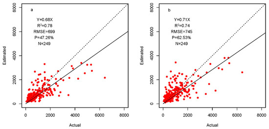 Comparison of the two mapping approaches at the residential neighborhood level. (a) The accuracy of the statistical modeling approach. (b) The accuracy of dasymetric mapping. The black lines are the zero-intercept regression lines.