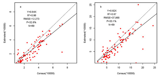 Supplementary analysis of the accuracy of the statistical modeling approach was carried out at the subdistrict level. A total of 89 subdistricts completely located in the fifth-ring area were employed to assess the accuracy of the estimated population from statistical modeling approach. The accuracies of the number of households and population were similar (Figure 6). The slopes of the zero-intercept regressions were close to 1, 0.84, and 0.87 for the households and population. The R2 values from the zero-intercept regressions were 0.86 and 0.87 for households and population, respectively. P was approximately 33%. In addition, the RMSE was 12,273 for the number of households and 37,868 for population, respectively.