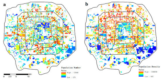 Population and population density distribution of the residential neighborhoods in Beijing’s fifth-ring area. (a) Population in each residential neighborhood and (b) population density (people/km2) at the residential neighborhood level.