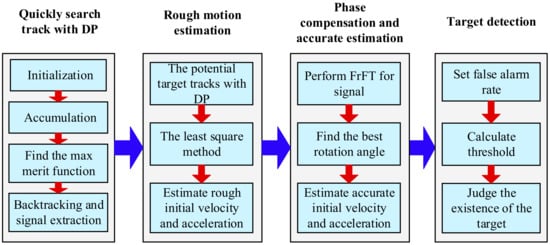 Therefore, a novel long-time coherent integration algorithm based on DP-FrFT is introduced in this section. The method performs track search and motion compensation with DP and FrFT, respectively, which can significantly reduce the calculation amount while maintaining the integration performance.