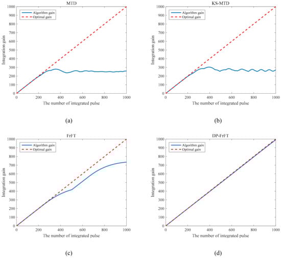 Figure 4a shows the integration gain of the MTD with the number of pulses. After about 200th pulse, the gain loss began to become obvious due to the DFM resulting from acceleration. When the number of the integrated pulse is greater than 400, the displacement of the target has been greater than one range unit, reaching the upper limit of loss, so its gain no longer changes. Figure 4b is the result of Keystone-MTD. Although it partially compensates for the RCM, the DFM still causes a very large gain loss. After about 500th pulse, its gain no longer changes. Figure 4c is the result of FrFT. It compensates the phase well and eliminates the effect of DFM. When the number of the integrated pulse is greater than 400, the target moved across one range unit and the gain loss began to become obvious. Finally, Figure 4d is the result of DP-FrFT. It corrects RCM and compensate phase at the same time, so there is almost no gain loss.