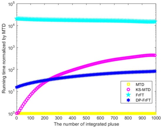 In Monte Carlo simulations, the radar system parameters are consistent with those in Table 1. The running time of different algorithms is shown in Figure 5 (the running time normalized by MTD).