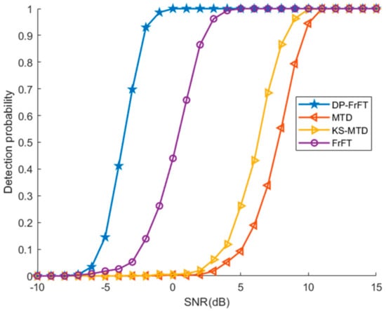As shown in Figure 6, DP-FrFT has the strongest detection performance, and the detection probability is close to 1 under the condition of SNR = 0 dB, while the sub-optimal FrFT needs to be SNR = 4 dB to achieve this detection probability. However, in the case of SNR lower than 0 dB, there is a sharp decrease in the curve of detection probability for DP-FrFT. Especially when SNR is lower than −8dB, the target is basically not detected. In fact, the sharp decrease of detection probability results from the limit of DP search capability. In an environment with an extremely low SNR, the track with the highest energy is probably not the track from target. Then the searched track will seriously deviate from the real track, and even the track cannot be effectively corrected using the estimated parameters of FrFT. So, the integration loss is serious and the detection probability is greatly reduced under extremely low SNR.